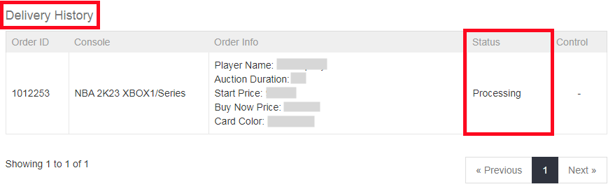 7. Check the withdrawal order status on "Delivery History". Please wait for a while until we buy your player card, then log in to collect your coins.